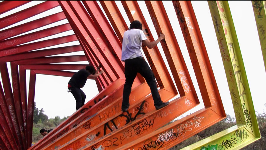 "Pandilleros" is an improvisatory exersice carried out with the collaboration of the students at Israel Martínez's Taller de Experimentación Sonora (Sound Experimentation Workshop). On their way through University City, they use Helen Escobedo's sculpture "Coatl" to complete the intervention. In contrast to the passive attitude expected of those who observe monuments, this action results in a concert of stones, bottles, and the boidies of the musicians, who use "Cóatl" as a huge instrument