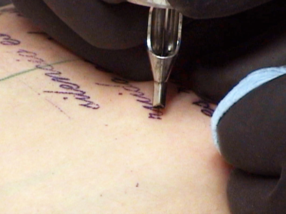 Action in which the arm is tattooed with a phrase that repeats itself: silence is noise silence is noise silence is noise silence is noise ... The audio is altered slightly, almost imperceptibly.