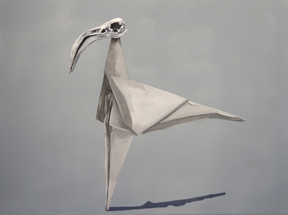 Five oil paintings on canvas exhibited show origami animals with skulls. On the one hand, the