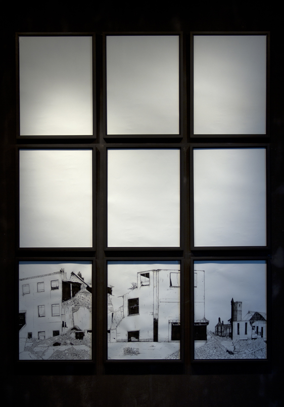 Last but not least a piece divided into nine panels depicting the falling buildings of a bombarded city. It is dedicated to the idea of space and of the durability of things: their lives and their ends. Space plays a very important role here: as it gives form and function to the emptiness of a plane piece of paper.