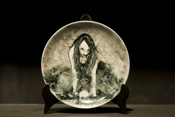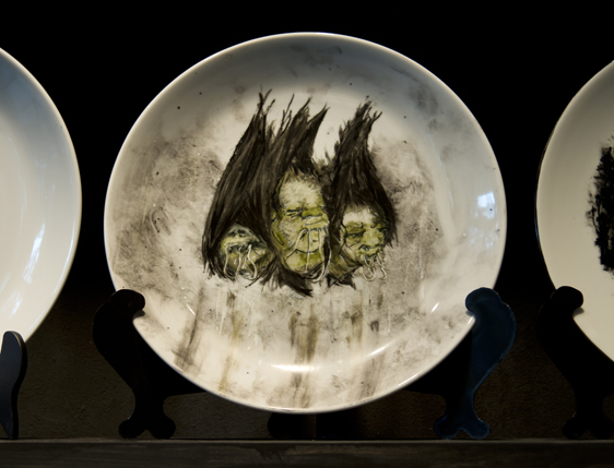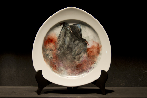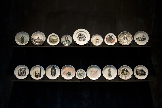 Other than these canvases, the artist will exhibit a series of porcelain plates with a production process completely different from that of the canvases: every single layer of paint has to be fired. The time that this process takes makes the piece susceptible to change. Exactly the same way as in case of the origamis, the outcome of this process questions the purpose of the base: it changes the concept of the plate as a functional object and recreates it as a plain white base that is malleable and can easily be transformed through the use of drawing.