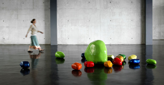 Most of the work that Mónica Escutia has developed during these last years, barely involves hand made processes. Acrylic laser-cut pieces in geometric and organic shapes as well as sculptures that have the appearance of rocks covered with automotive paint, remind us of minimalist art. Nevertheless, her work has a unique strength and brightness, which triggers its own qualities as objects in the environment. Unlike minimalist art, Escutia manages to show sensuality, due to the shapes and color application on each of her rock sculptures.