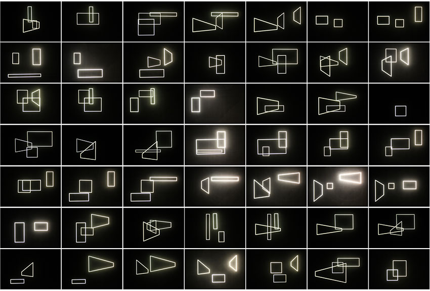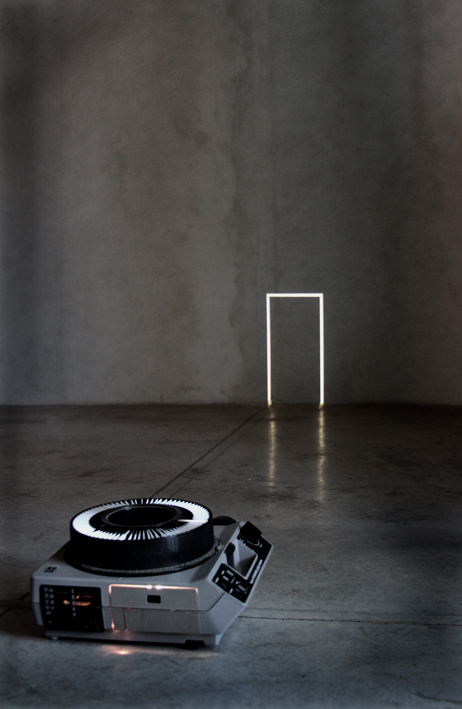 There are near 580 000 different combined forms created by the contraposition of the shapes projected in each of the 3 slide projectors, while the fourth projects forms that look like doors of different sizes. These forms play with the lines that separate the wall from the floor, and gives the perspective of different doors delimiting the space while the people stares at the possibility of a new door or a new and real architectural place.