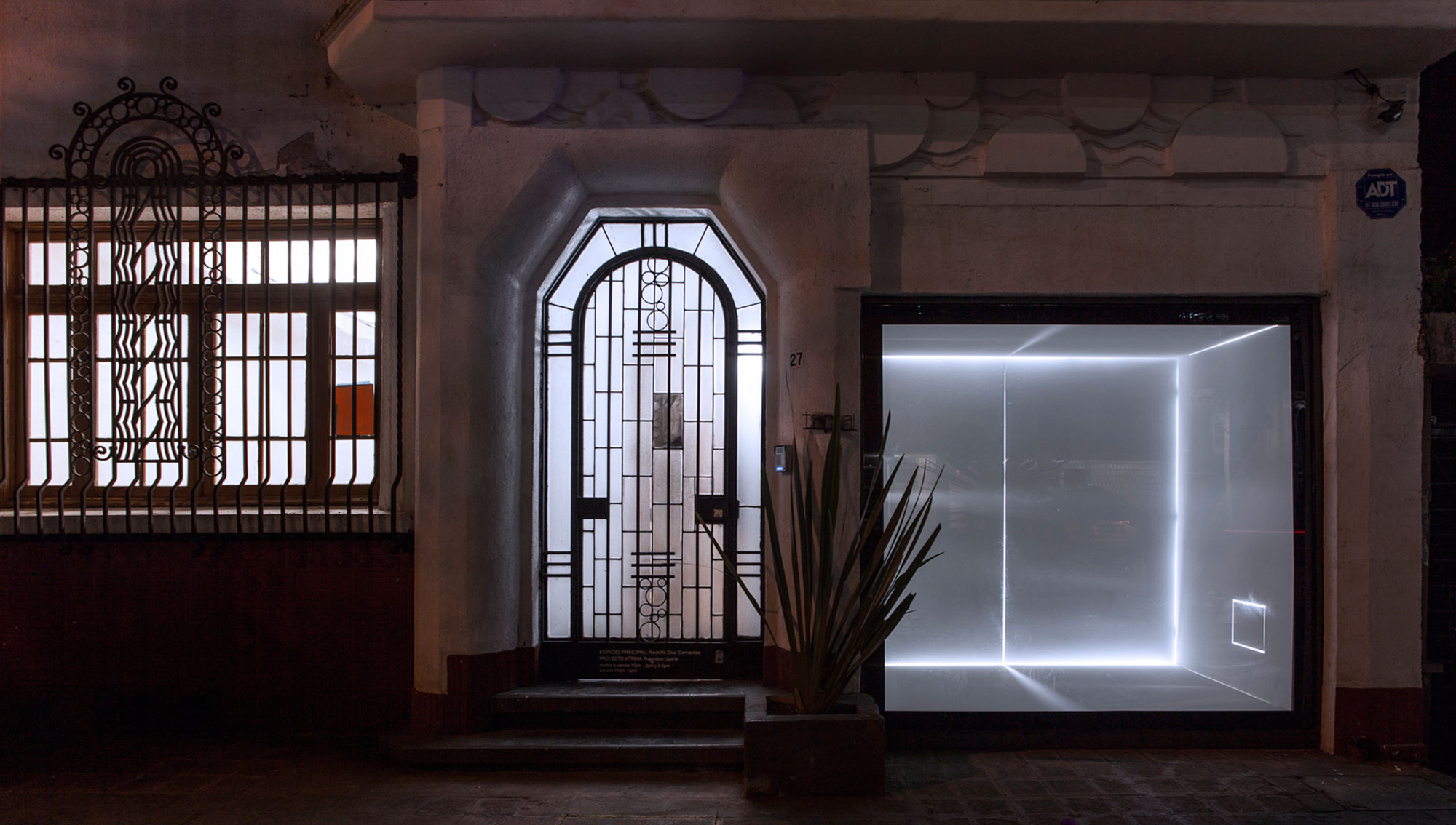 The light helps us recognize the place, because once enlightened it becomes exposed as a space and validates itself as a concept. Window displays have been created to display valuable objects. However, in this case what is meant to be exhibited is the concept of the window display itself. The light manages to go through the gaps of the vitrine generating in the spectator, on one hand, the idea of limit due to the inability to see beyond the borders of its architecture and, on the other hand, a desire to see the source of light.